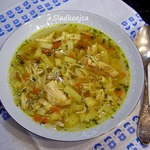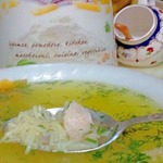 Куриное мясо разобрать на небольшие кусочки и положить обратно в бульон.