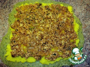 Замесить тесто из муки, 1 ч.л соли, измельченного шпината (разморозить его в микроволновке и отжать лишнюю жидкость), яиц и 1 ст.л масла. Завернуть а пленку и в холодильник на 1 час.