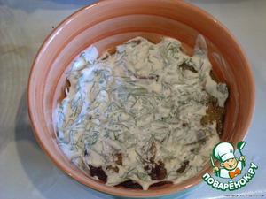 Сейчас укладываем наши баклажаны слоями в мисочку, промазывая каждый слой нашим соусом.