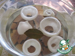Приготовить маринад. Положить в воду лавровый лист, перец, сахар и соль и поставить на огонь закипать, когда закипит снять с огня и добавить уксус. Пока готовится маринад разобрать лук. Срезать у лука верхнюю часть и аккуратно выдавить серединку.