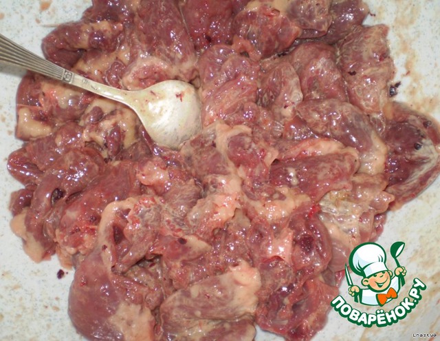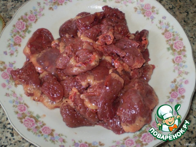 Куриные сердечки хорошо промыть, дать им стечь.