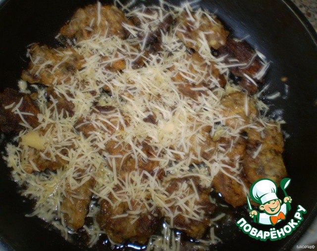 Сыр трем на терке, выкладываем готовые отбивные в сковородку и сверху хорошо присыпаем тертым сыром и держим под закрытой крышкой 2-3 мин.