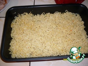 Вермишель запарить, яйца нарезать кубиками, сосиски - соломкой