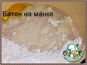 В теплую манку добавляем подошедшую опару, яйцо, перемешаем и начинаем понемногу всыпать просеянную муку. -