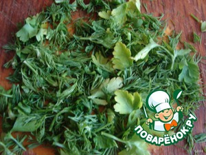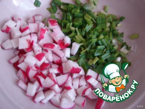 Меленько нарезаем редиску, укроп, петрушку и лучок, кубиками нарезаем отварные яйца.