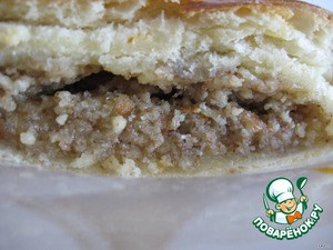 Пока тесто "бродит", приготовить начинку. Перемолоть в мясорубке или блендере грецкие орехи. Добавить сахар и растопленное сливочное масло, хорошо перемешать.