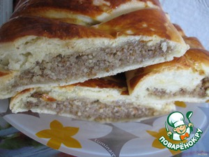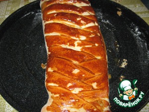 Уложить полосы теста внахлест, чередовать их, как при плетении косы. Конец завернуть и прижать.
