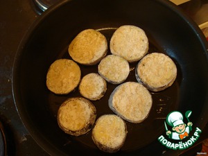 Обмaкнуть баклажаны в муке и обжарить на сковоpoде до золотистого цвета. -
