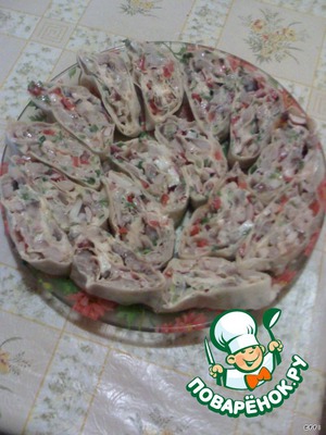 Прочитала на сайте много рецептов рулетов из лаваша, но сама никогда не делала. Сегодня увидела в супермаркете лаваш, купила и сделала рулетик из того, что было в холодильнике. Всем понравилось!