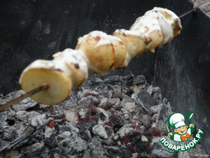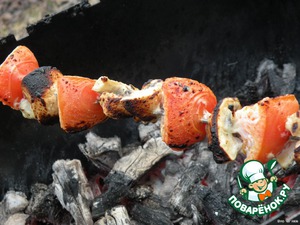 • Овощи на 5 минут опускаем в маринад от курочки и потом жарим на углях, получается очень нежненько!