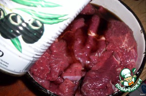 Поперчить + чуть-чуть посолить, положить в емкость, залить соком из-под маслин, поставить в холодильник, мариновать 5 -12 часов
