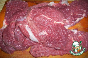 - телятину нарезать на пластики толщиной 1 -1.5 см, отбить с двух сторон,