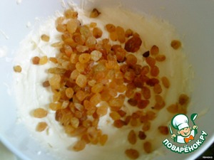 Перед тем, как выкладывать массу в формочки, перемешать ещё раз - изюм тяжелее и ложится на дно.