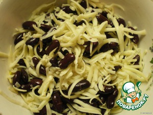 Фасоль выложить в салатник и добавить тёртый сыр и измельчённый чеснок. |