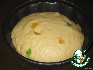 Через указанное время в опару добавить остальной сахар, изюм (или другие фрукты, в этот раз я делала с цукатами), ванилин, корицу, растительное масло и замесить мягкое тесто. Прикрыть и оставить на 1.5 часа подходить в теплом месте.