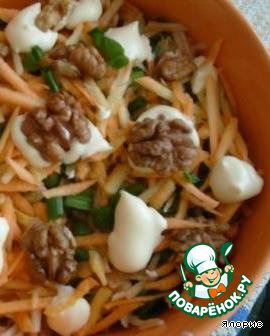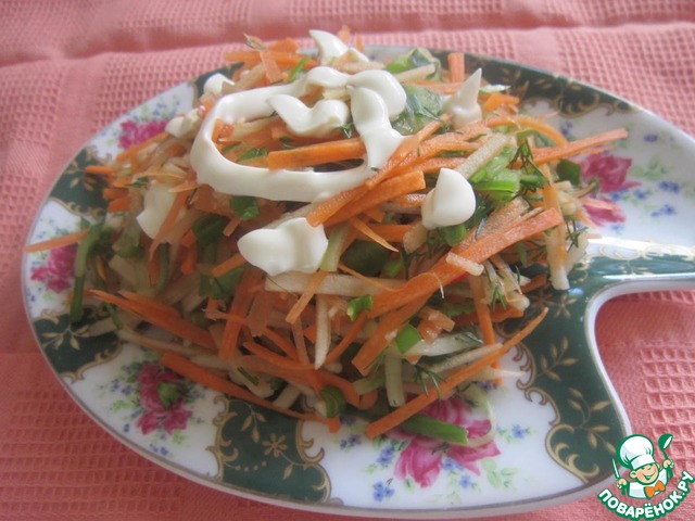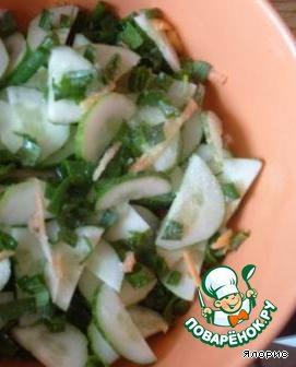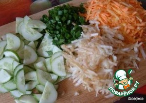 Морковь трем на крупной терке, огурец нарезаем тонкими полукружками, трем мелко яблочко,нарезаем зелень.