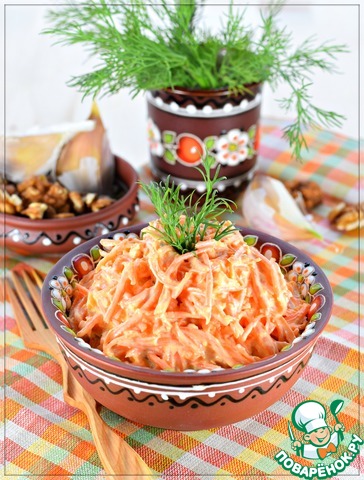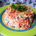 На нее кладем заправку и половинки ядрышек грецкого ореха. Салатик можно подавать!!!