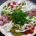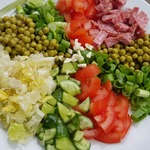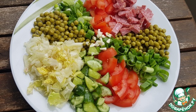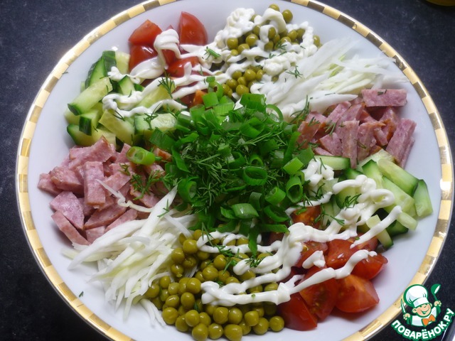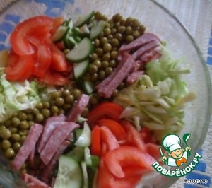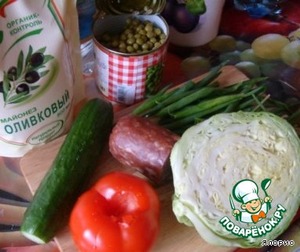 Овощи промываем, обсушиваем и измельчаем: капусту режем мелко, огурец - тонко, помидоры - ломтиками, колбасу - брусочками, мелко нарезаем зелень.