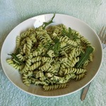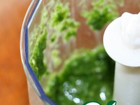 Рукколу освободить от стеблей и измельчить в блендере вместе с зубчиком чеснока, базиликом, 1ст. л. лимонного сока и 1 ст. л. оливкового масла. |