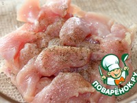 Филе нарезать небольшими кусочками. Посолить, поперчить. Залить 2ст. л. лимонного сока, перемешать и оставить на 10-15 минут. |