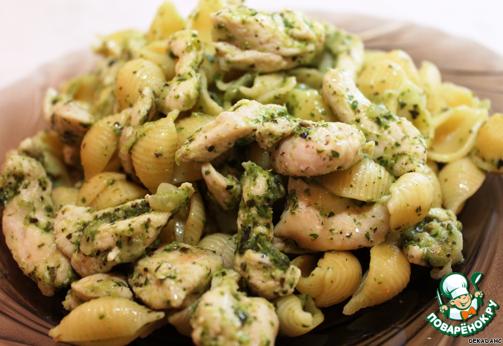 Соединить пасту с зеленью и куриным филе и аккуратно перемешать. При желании посыпать тертым пармезаном. Приятного аппетита! |