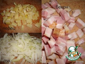 Лук режем полукольцами, болгарский перец нарезаем кубиками и отправляем к бекону, жарим при постоянном помешивании до золотистого цвета.
