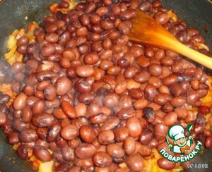 Обжаренную фасоль перекладываем в кастрюлю и заливаем водой, в которой варилась фасоль.