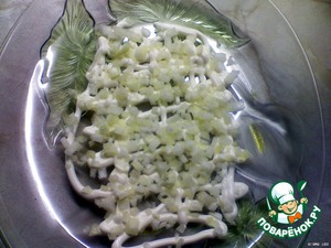 На дно салатника выложить немного майонеза, посыпать половину лука. -
