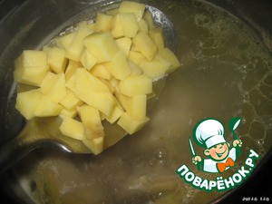 Когда курица сварится, вынимаем морковь, а в бульон кладём нарезанный картофель.