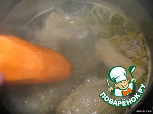 Курицу нарезать на порционные куски (у меня половинка курицы, на 3 литра воды), залить водой, поставить на огонь. Как закипит, снимаем пену и кладём целую, очищенную морковь. Варим на медленном огне минут 30 (зависит от "вредности" курицы).