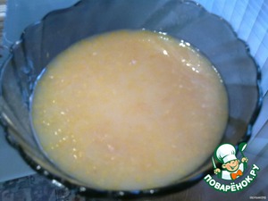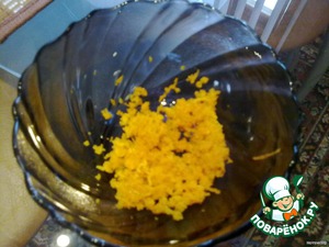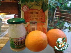 • Выжимаем сок из двух апельсинов, добавляем к цедре. Перемешиваем, выливаем 3 столовых ложки вина, добавляем хрен. Если хрен очень "злой" - достаточно чайной ложки.