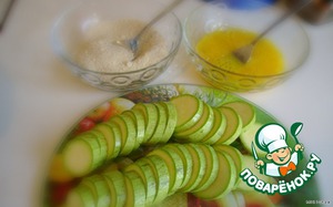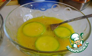 Кабачки нарезать дольками толщиной около 0,5 см. Яйцо взбить с молоком. Сыр смешать с панировочными сухарями. Приправить солью, молотым черным перцем и добавить сушённый чеснок молотый по вкусу.