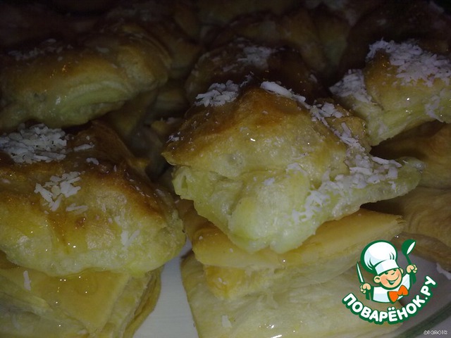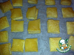 Размороженное слоеное тесто разрезать на квадратики (или прямоугольники), как у Вас получится или больше нравится. Поставить запекаться в духовку. Пирожные готовы, когда хорошо поднялись и подрумянились.
