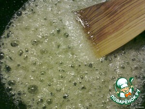 В сковороду высыпать сахар, добавить 5 столовых ложек воды и уварить до получения густого сиропа.