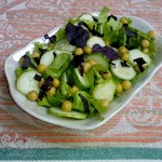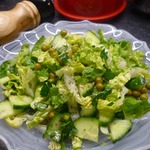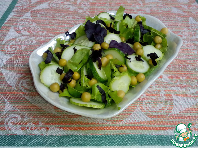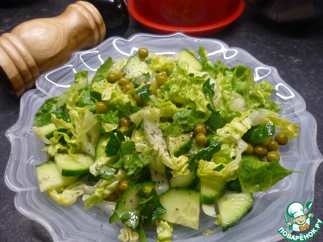 В салатницу выложите консервированный горошек, порезанные соломкой огурец, салатную капусту и зелень.