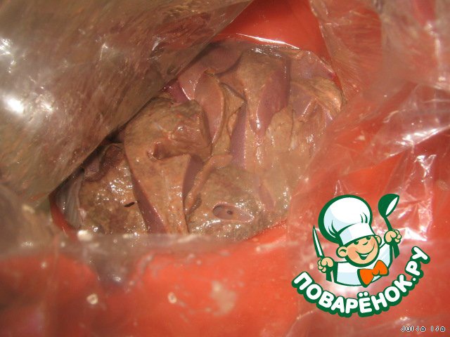 Завязываем рукав с другой стороны, и путём переворачивания рукава, добьёмся равномерного распределения соуса. Кладём рукав на противень, делаем иголкой несколько дырочек, для выхода воздуха, ставим в духовку, которая уже разогревается до 180 градусов. Запекаем минут 40. Последние 10 минут, разрезаем рукав и даём печени и овощам немного "подышать".