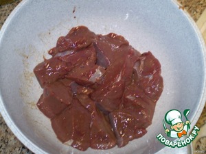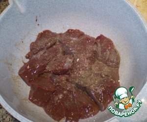 • Кусочки печени посолить, поперчить, дать парочку минут настояться.