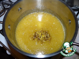 Снять кастрюлю с огня, когда немного остынет, добавить 1 яйцо, 1 желток, перемешать все.