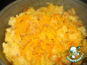 • Затем добавляем рис и заливаем кипятком на расстояние 1 см от риса, не мешаем, накрываем крышкой и тушим, пока вода не выпарится.