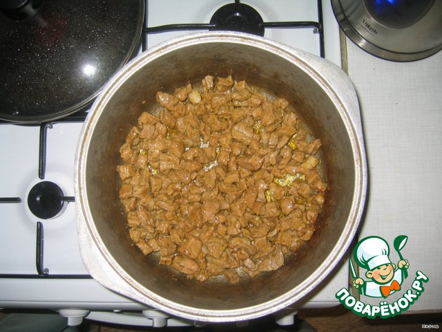 • Свинину прямо в кастрюли смешиваем со специями, добавляем оливковое масло и обжариваем до золотистой корочки.
