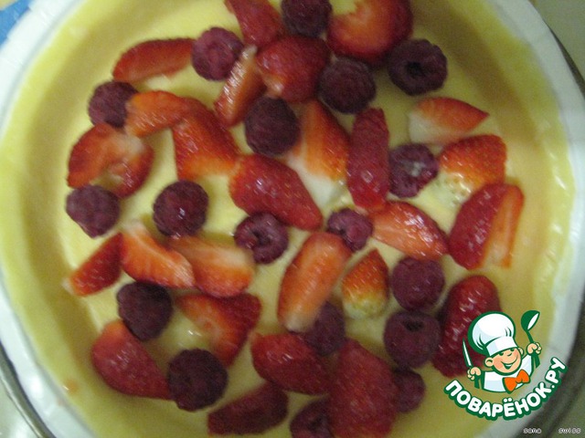 Тонко раскатанное тесто выложить в форму на бумагу для запекания, на тесто выложить фрукты: малину - целиком, клубнику разрезать на 2-3 части.