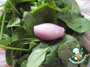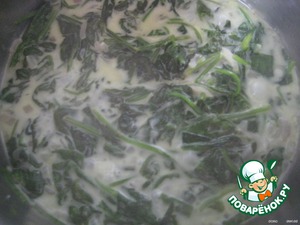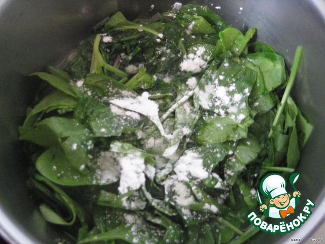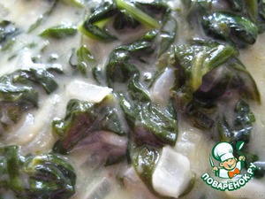 Добавляем шпинат, солим, перчим, добавим кукурузную муку и тушим, помешивая, пока шпинат не уварится.