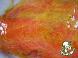 В смеси из горчицы, масла оливкового, соли, перца и кленового сиропа замаринуем форель.