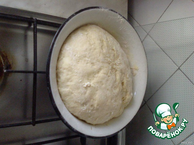 • Сперва готовим опару: в разогретое молоко засыпаем дрожжи, добавляем сахар, соль, вбиваем яйцо. Отправляем всё, предварительно перемешав, в тёплое место. Через минут 15 начинаем добавлять муку и подсолнечное масло. Замешиваем тесто. Отправляем в тепло. Ждём, когда тесто подымется.