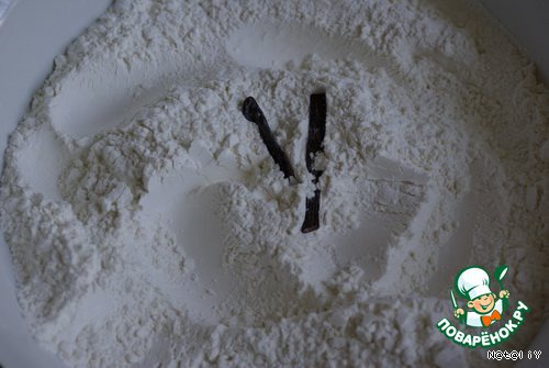 Смешать муку, ванилин, разрыхлитель и крахмал.
