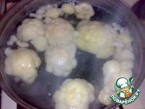 Отварить в кипящей подсоленной воде цветную капусту ( примерно 5мин.).