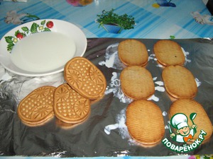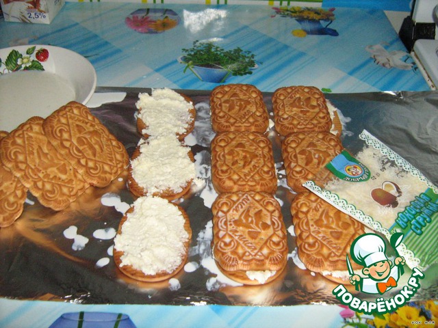 На фольгу или пергамент, или пищевую плёнку укладываем печенье тремя столбиками на расстоянии, предварительно смачивая в молоке.