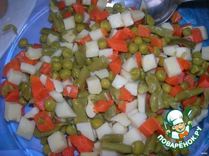 Это смесь "Оливье", кстати, очень любит мой кот. Состав: зелёный горошек, резаные морковь, картофель, стручковая фасоль.