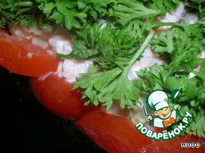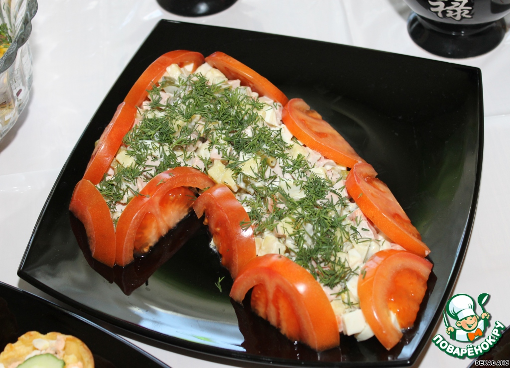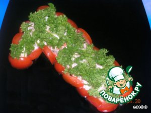 Далее украшаем в виде "Единицы" - всё-таки 1 Мая. По кругу выкладываем резаные помидорки черри. А верх украшаем кудрявой петрушкой. С праздником!!!