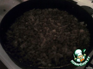 В сковородке перемешиваем отварную чечевицу, тушенку кусковую и лук минут десять.
